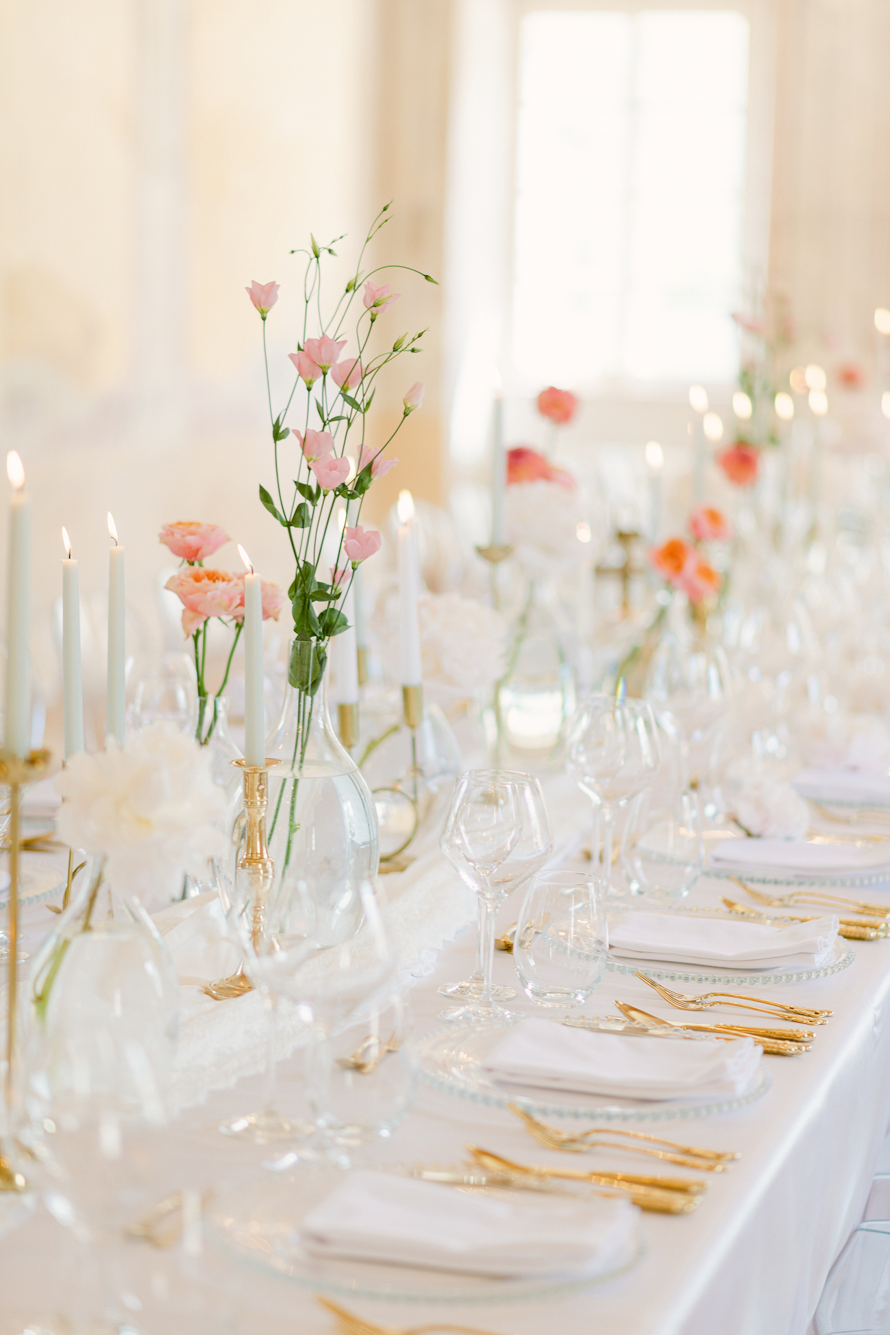 * White charger with golden rim, classical china, modern glass, golden cutlery
